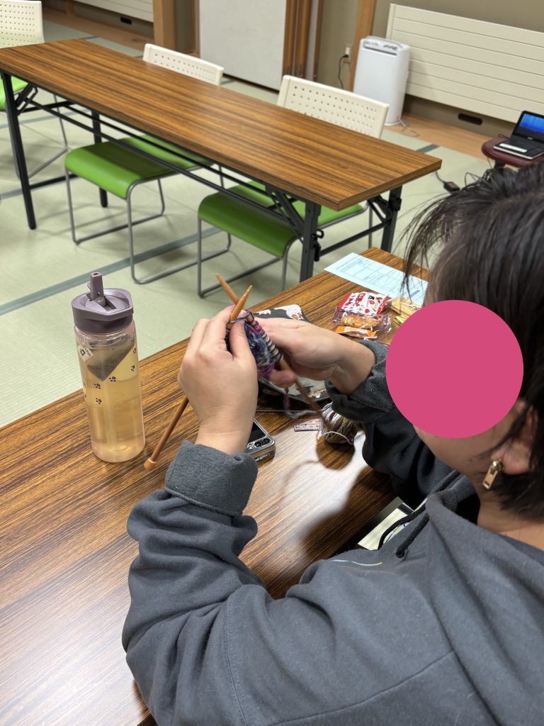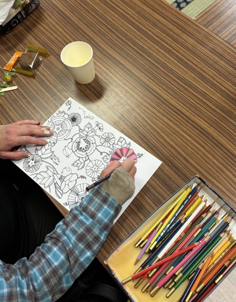 読書とおしゃべりして過ごすニトさん、編み物のこきんちゃん、ぬり絵のりんごさん